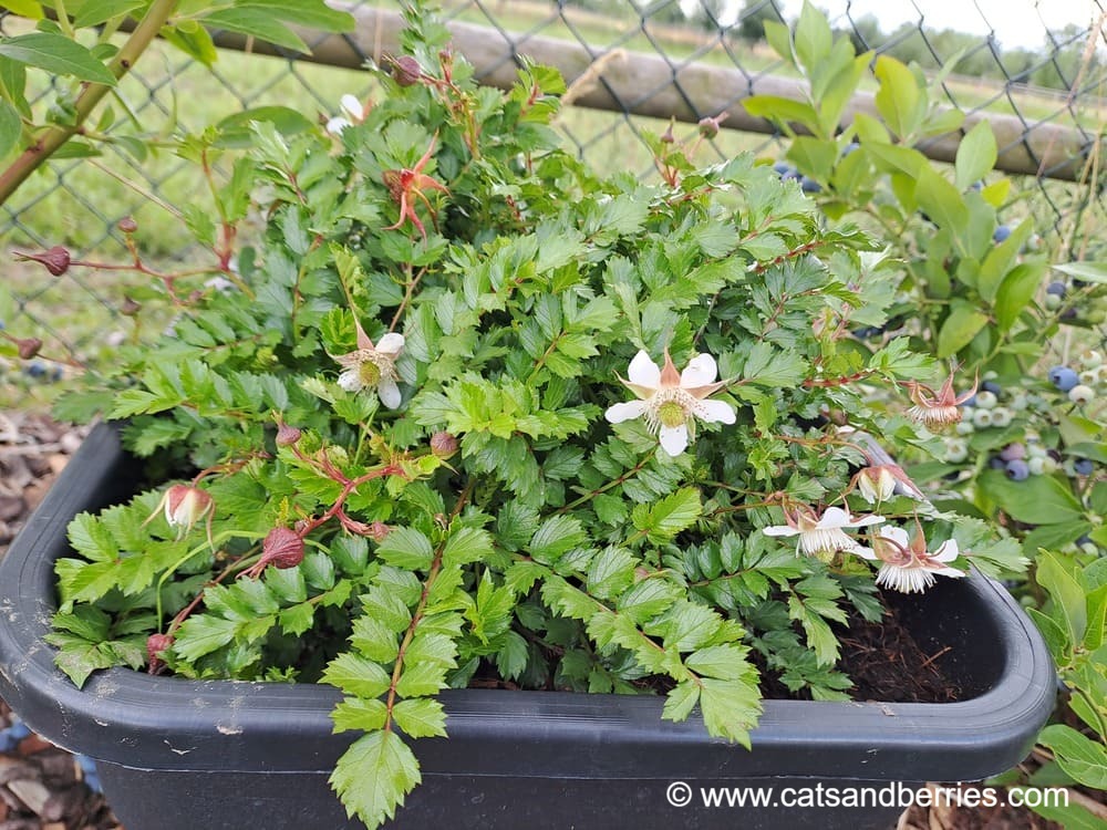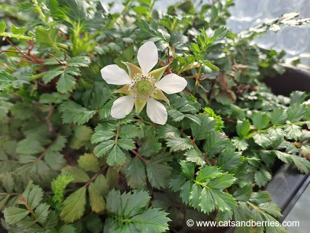 A very attractive ground cover plant for light sandy soils or rock gardens. It flowers throughout the summer and produces very soft, slightly sweet berries. The plant has small curved thorns that protect it from slugs. Winter hardy to around -10°C.
